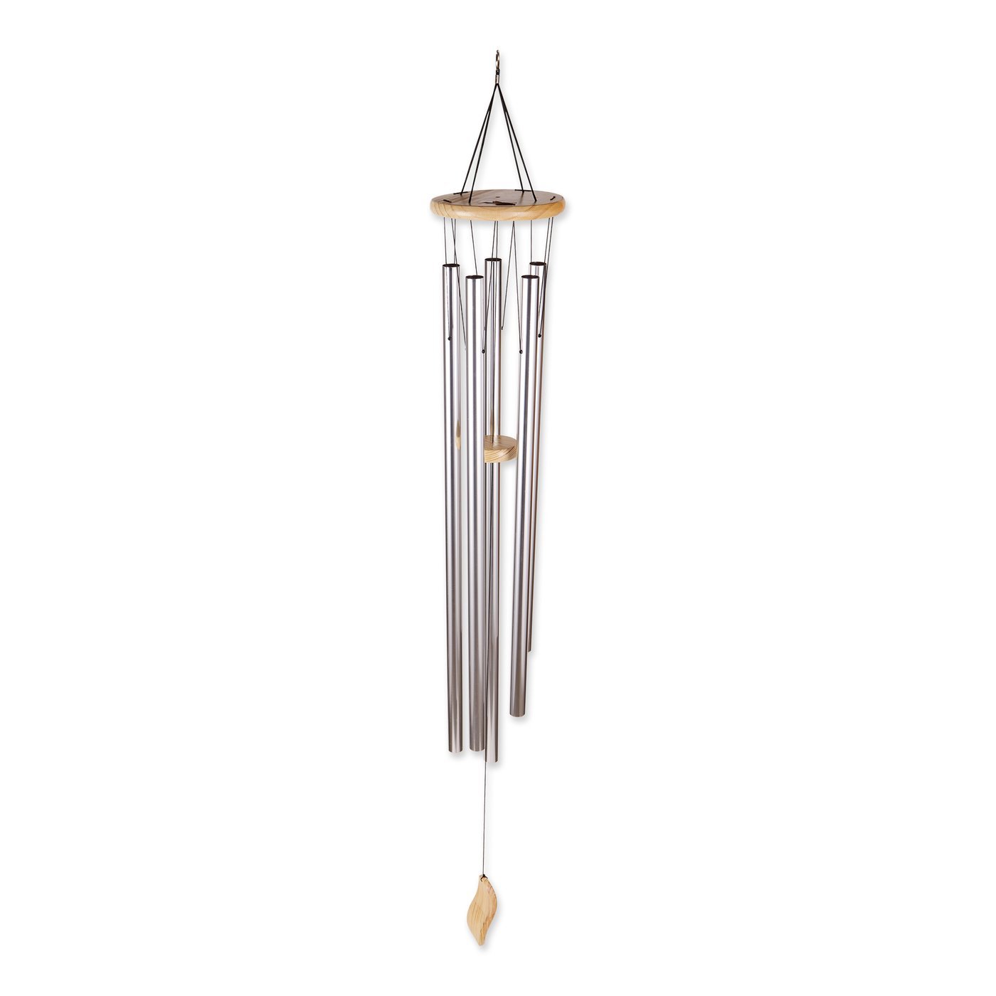 This very long Vista windchime measures 57 inches long from the top of the set of chimes to the hanging pendant. Wood accents and silver-tone pipes. Weight 3.4 pounds. Ring at top for hanging. 7 inches in diameter x 57 inches long. Aluminum and pine wood.