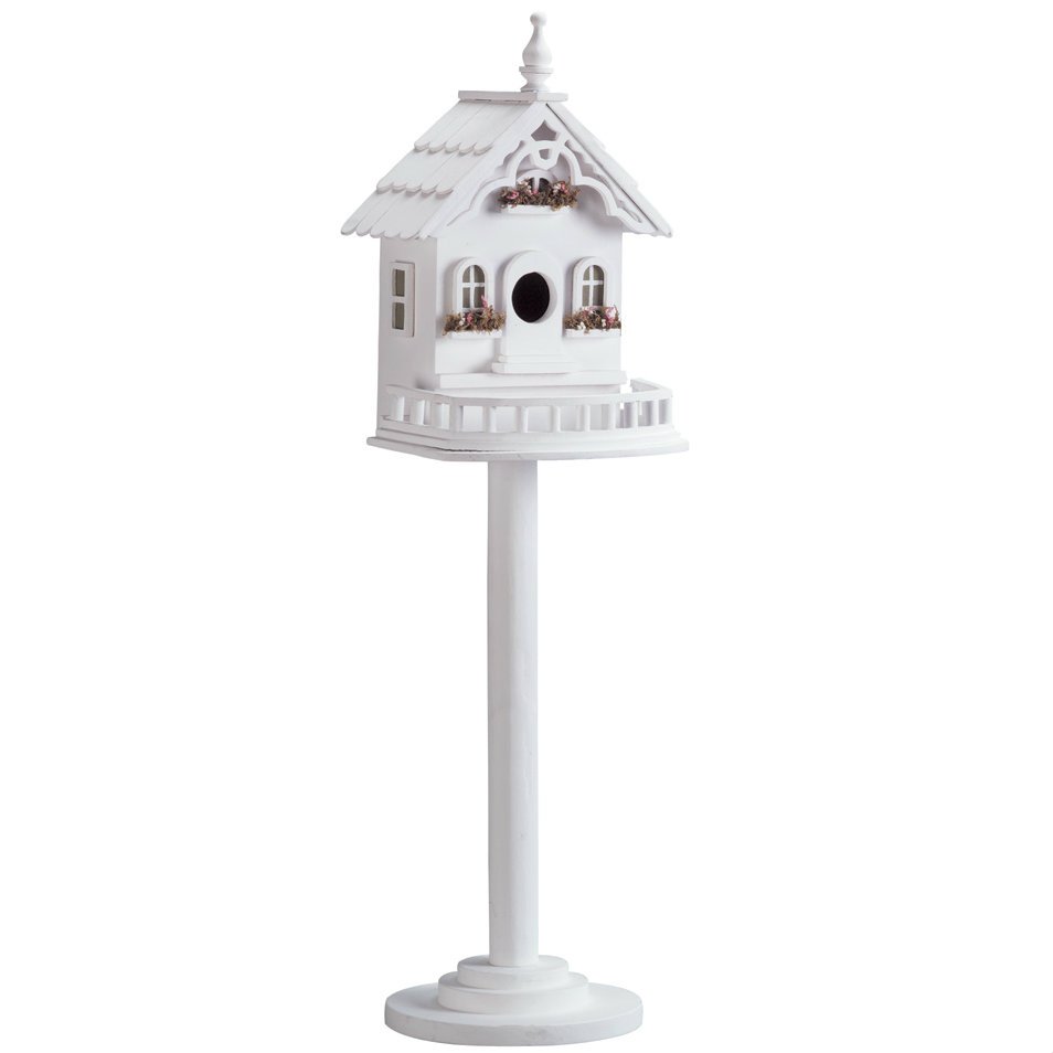 Freestanding birdhouse can be placed anywhere. The little touches make this so unique and charming, like the tiny flower boxes, scalloped roof shingles and quaint gingerbread. Clean-out hole in back. Weight 3.2 pounds. 9.4 x 8.4 x 29.2 inches tall. Base is 8.75 inches in diameter. Fir wood and plywood.