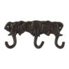 Wall hook set features three elephant heads, and their trunks are handy hooks. Perfect for hanging keys, scarves, or just about anything. Made of durable cast iron with a rustic finish. Use indoors or outdoors. 1.63 pounds. 10.5 x 1.5 x 4.75 inches tall. Cast iron.